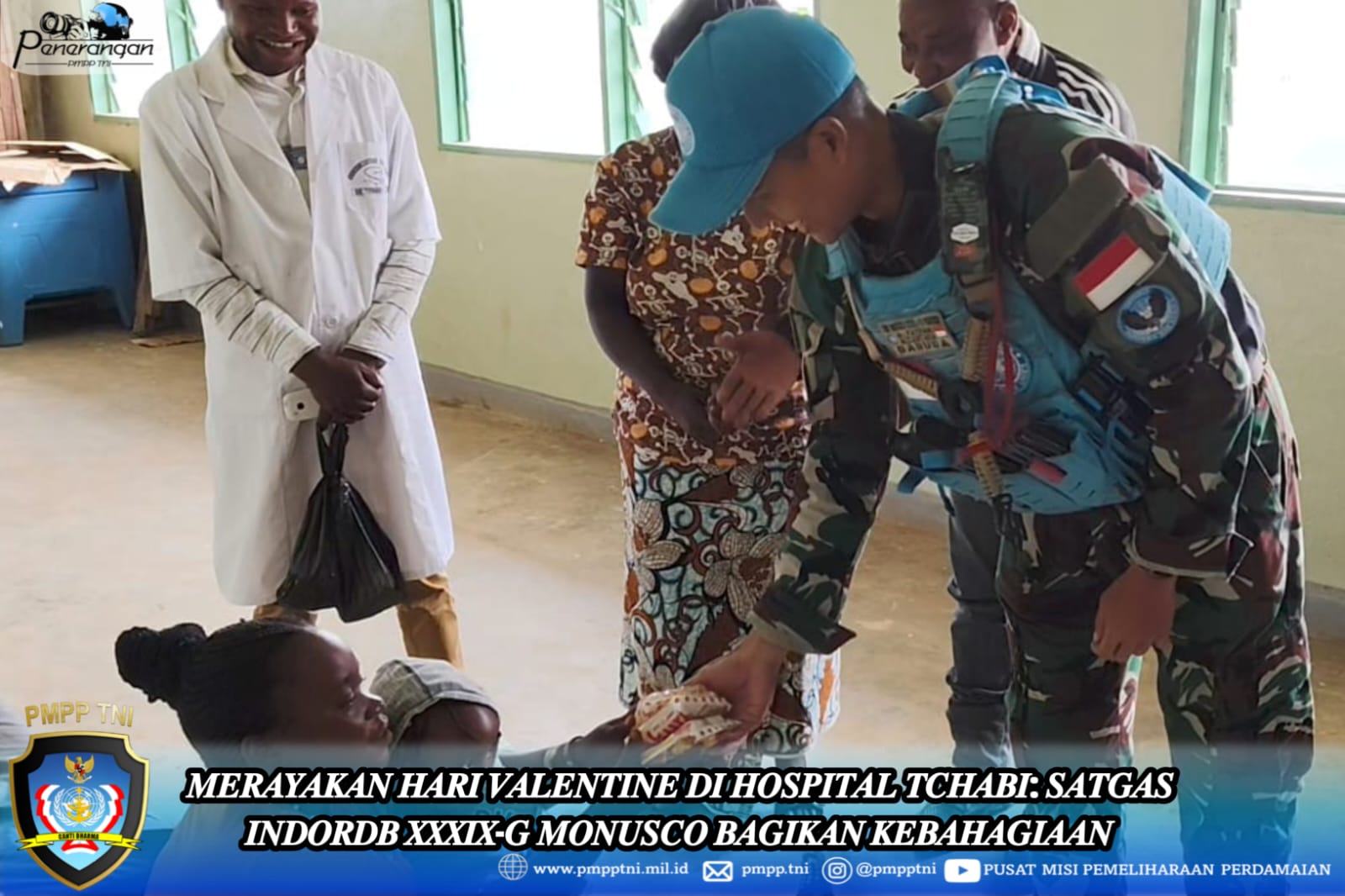 Satgas INDORDB XXXIX-G MONUSCO dari TOB Tchabi melaksanakan kegiatan CIMIC dalam rangka perayaan Hari Valentine di Hospital Tchabi pada 14 Februari 2026. Kegiatan ini dipimpin oleh Mayor Ckm dr. Fathan dan diikuti oleh 14 personel. Tim membagikan hadiah kepada pasien dan tenaga kesehatan sebagai bentuk kepedulian dan dukungan moral.