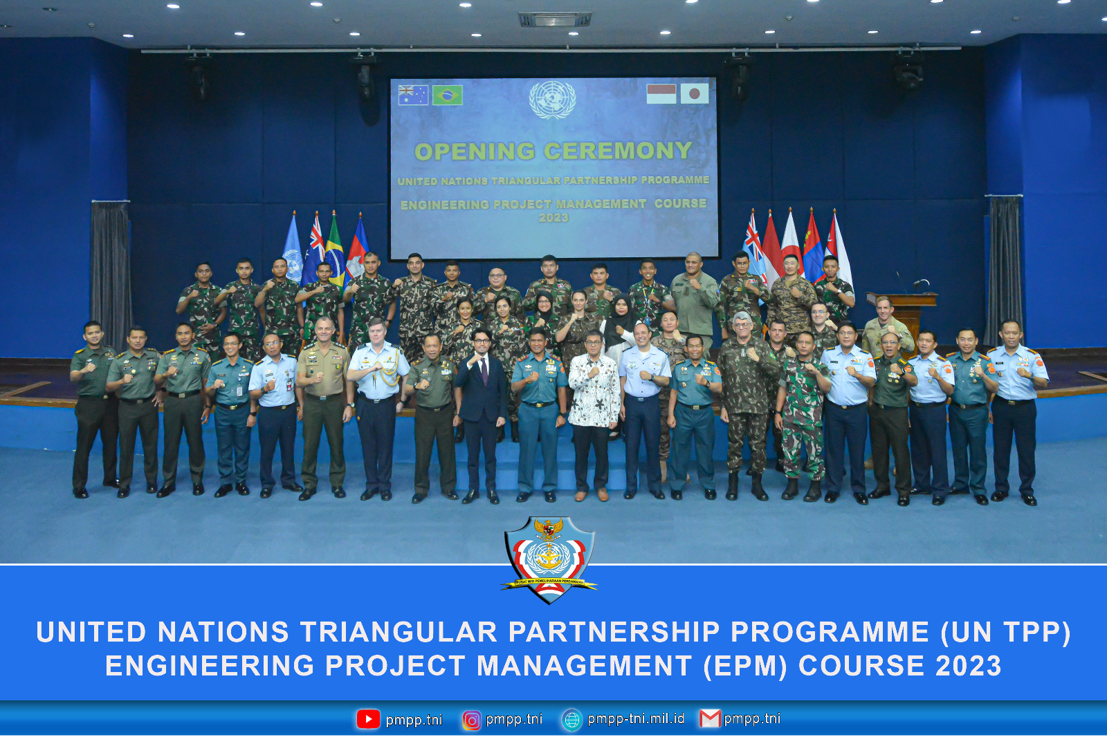 Komandan PMPP TNI Laksda TNI Retiono Kunto, S.E., M.A.P., CRMP., M.Tr.Opsla secara resmi membuka UNITED NATIONS TRIANGULAR PARTNERSHIP PROGRAMME (UN TPP) ENGINEERING PROJECT MANAGEMENT (EPM) COURSE 2023 pada tanggal 17 Juli 2023 di Auditorium PMPP TNI, Sentul Bogor.