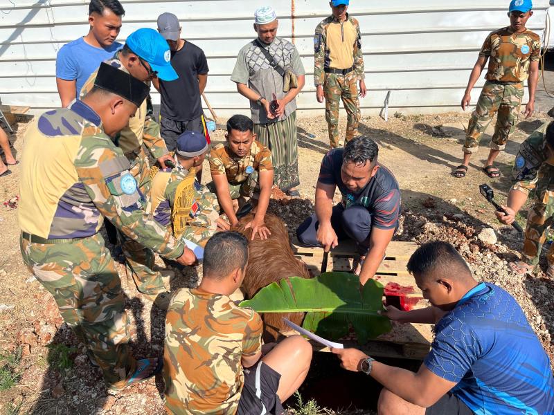Usai sholat, acara dilanjutkan dengan pemotongan hewan qurban pada pukul 08.00 LT, yang terdiri dari 7 ekor kambing hasil gotong royong personel Kontingen Garuda. Proses penyembelihan dilaksanakan dengan penuh hikmah, sesuai dengan syariat Islam dan protokol kebersihan yang berlaku. Ketua Panitia Pemotongan Hewan Qurban, Lettu Laut (P) Imam Suganda, S.Tr.Han., menyampaikan bahwa seluruh tahapan dilakukan dengan penuh tanggung jawab dan semangat kebersamaan, sebagai bentuk ibadah sekaligus penguatan nilai kekompakan satuan.