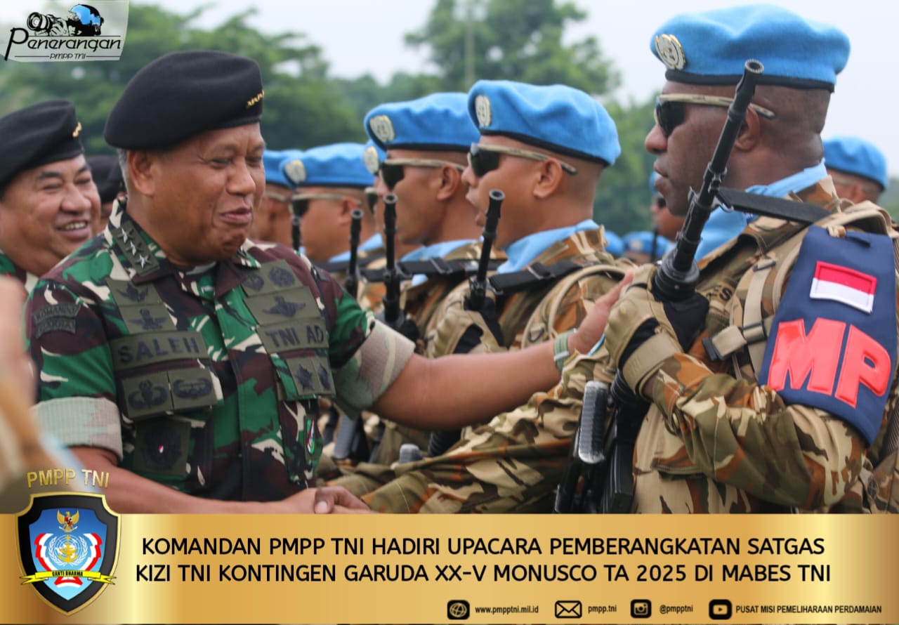 Komandan PMPP TNI Mayjen TNI Taufik Budi Santoso, S.Hub.Int., M.H.I. menghadiri Upacara Pemberangkatan Satgas Kizi TNI Konga XX-V MONUSCO TA 2025, bertindak selaku Inspektur Upacara Irjen TNI Letjen TNI Muhammad Saleh Mustafa bertempat di Lapangan PRIMA Mabes TNI Cilangkap, Jakarta Timur. Kamis (19/06/2025).