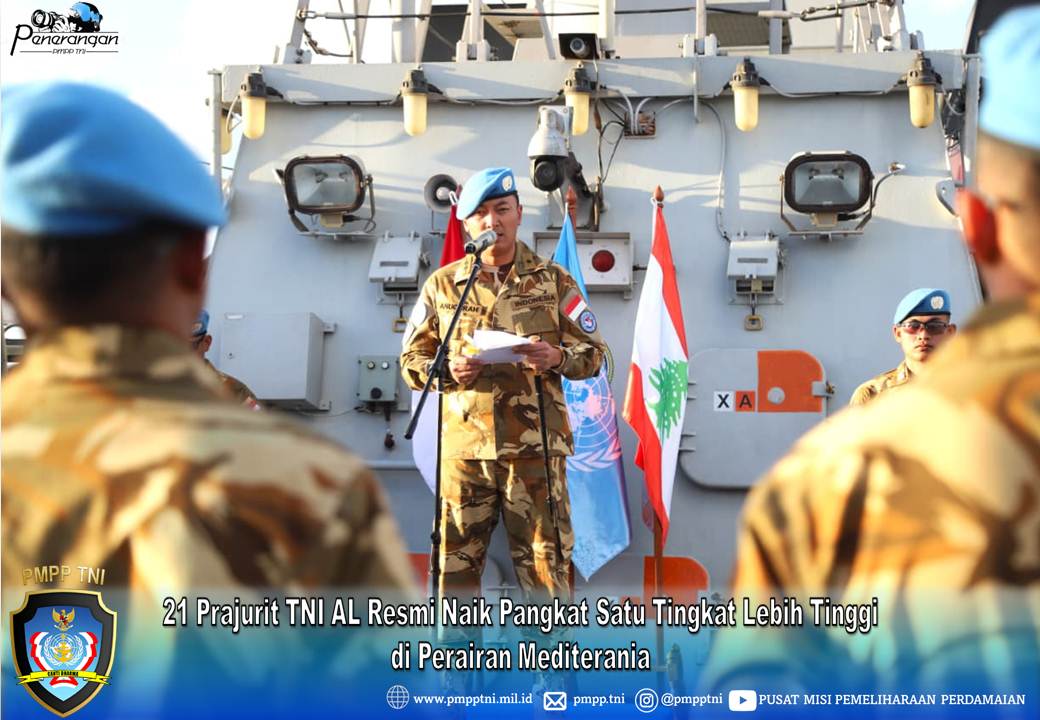 Perairan Mediterania, 1 Oktober 2025,—- Sebanyak 21 prajurit TNI AL yang tergabung dalam Satgas MTF TNI Konga XXVIII-P/UNIFIL resmi menerima kenaikan pangkat satu tingkat lebih tinggi dari pangkat lama dalam Upacara Laporan Korps Kenaikan Pangkat yang berlangsung di Geladak KRI Sultan Iskandar Muda-367 yang tengah melaksanakan operasi di Area of Maritime Operation, Rabu (01/10) kemarin.
