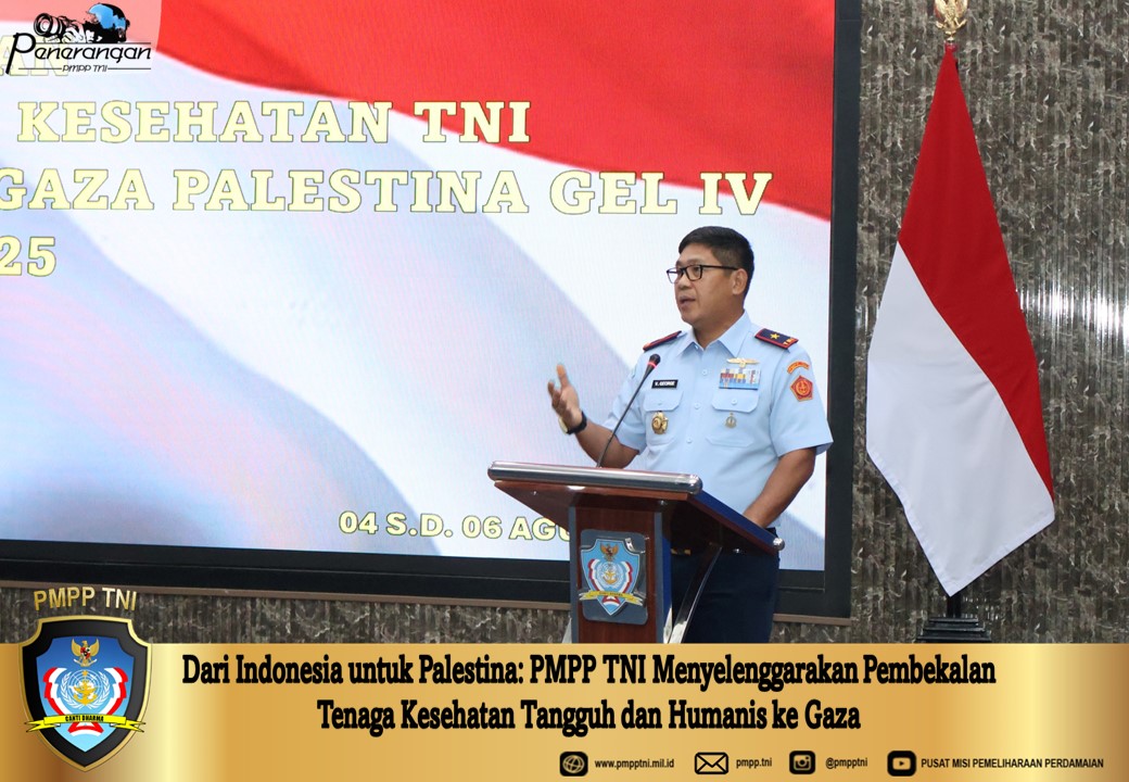 Sebagai wujud nyata kepedulian bangsa Indonesia terhadap krisis kemanusiaan yang terjadi di Gaza, Palestina, Pusat Misi Pemeliharaan Perdamaian (PMPP) TNI diberikan tugas untuk menyelenggarakan pembekalan kepada 25 personel Tenaga Kesehatan TNI Gelombang IV Tahun 2025, bertempat di Gedung Auditorium PMPP TNI, Sentul, Kabupaten Bogor, pada Senin (4/8/2025).