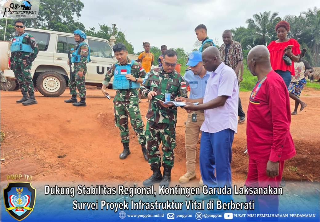 BERBERATI, REPUBLIK AFRIKA TENGAH – Satuan Tugas Kompi Zeni (Satgas Kizi) TNI Kontingen Garuda XXXVII-K Minusca, yang dipimpin oleh Dansatgas Letkol Czi M. Imvan Ibrahim, S.Sos., M.Han., melaksanakan survei untuk proyek perbaikan infrastruktur jalan di Kota Berberati pada hari Jumat, 15 Agustus 2025. Kegiatan ini merupakan tindak lanjut dari perintah langsung dari Special Representative of the Secretary-General (SRSG) Minusca, Valentine Rugwabiza, untuk mendukung program pemerintah Republik Afrika Tengah dan Perserikatan Bangsa-Bangsa (PBB) dalam meningkatkan aksesibilitas transportasi bagi masyarakat.