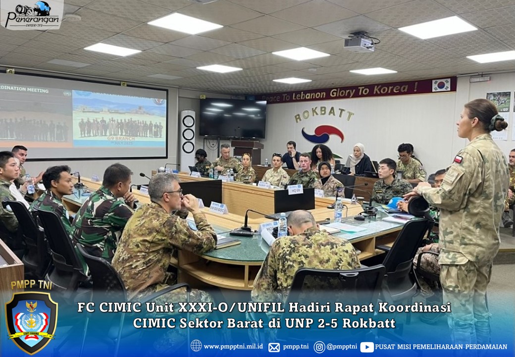 Rabu, 9 Juli 2025 — FC CIMIC Unit XXXI-O/UNIFIL menghadiri Rapat Koordinasi CIMIC (CIMIC Coordination Meeting/CCM) Sektor Barat yang dilaksanakan di UNP 2-5 ROKBATT. Rapat ini bertujuan untuk meningkatkan koordinasi dan sinergi antarunit CIMIC dalam mendukung pelaksanaan mandat pemeliharaan perdamaian UNIFIL di wilayah Sektor Barat.
