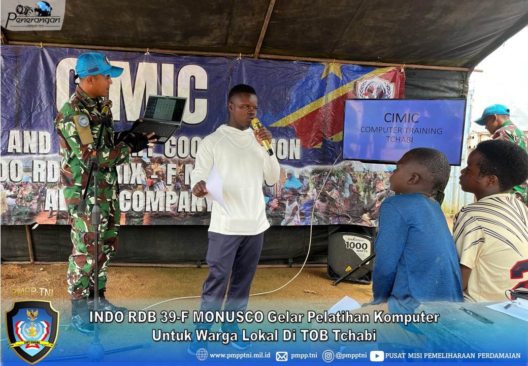 Tchabi, Republik Demokratik Kongo, 1 September 2025 — Satgas INDO RDB 39-F MONUSCO melalui personel Kompi A TOB Tchabi melaksanakan kegiatan Civil Military Coordination (CIMIC) berupa pelatihan komputer bagi warga lokal di sekitar wilayah Tchabi. Kegiatan yang berlangsung pada pukul 10.00 LT ini dipimpin oleh Kapten Inf Jarwadi selaku Komandan Tim, didampingi Kapten Inf Kadek Dwipa sebagai pelatih utama, serta delapan personel lainnya dari berbagai fungsi seperti CIMIC, penerangan, kesehatan, komunikasi, dan pelatih pendamping. Pelatihan turut dihadiri oleh perwakilan masyarakat, Mr. Jhon, dan diikuti oleh 15 orang warga lokal sebagai peserta.