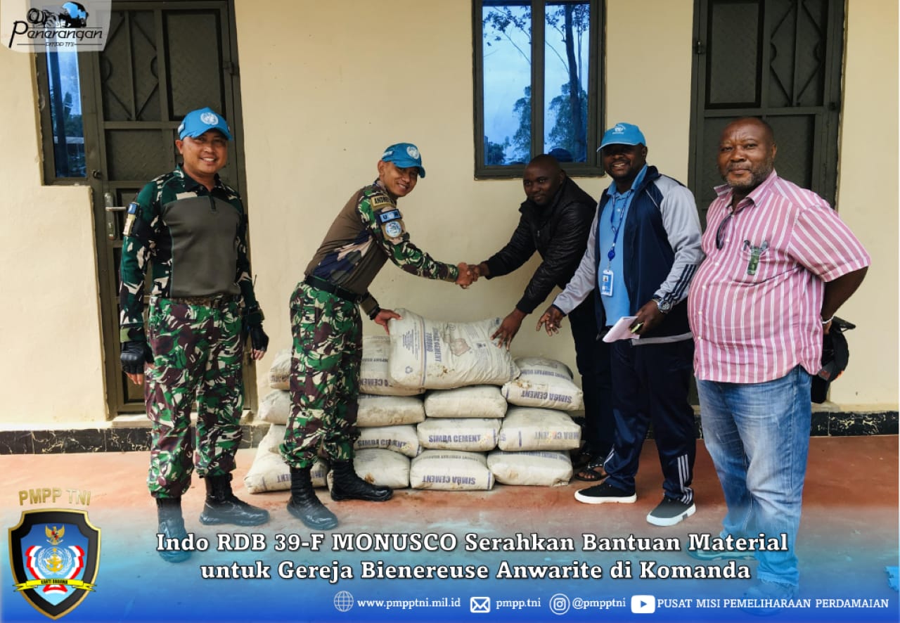 Komanda, 10 Agustus 2025 — Satgas INDO RDB 39-F MONUSCO melalui personel Kompi B Komanda melaksanakan kegiatan kemanusiaan berupa pemberian bantuan material semen kepada Gereja Bienereuse Anwarite Catholic Church di Komanda Center. Kegiatan ini dipimpin langsung oleh Wadansatgas, Letkol Inf Edward Samosir didampingi oleh Komandan Kompi B Mayor Inf Andrey Satria Wicaksana.