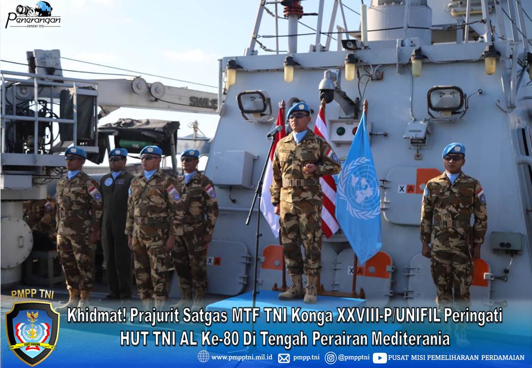 Laut Mediterania, 10 September 2025,—- Dalam rangka memperingati Hari Ulang Tahun (HUT) TNI AL Ke-80, prajurit Satgas MTF TNI Konga XXVIII-P/UNIFIL melaksanakan upacara di geladak heli KRI Sultan Iskandar Muda-367 (KRI SIM-367) yang tengah melaksanakan patroli rutin di Perairan Mediterania, Lebanon, Rabu (10/09).