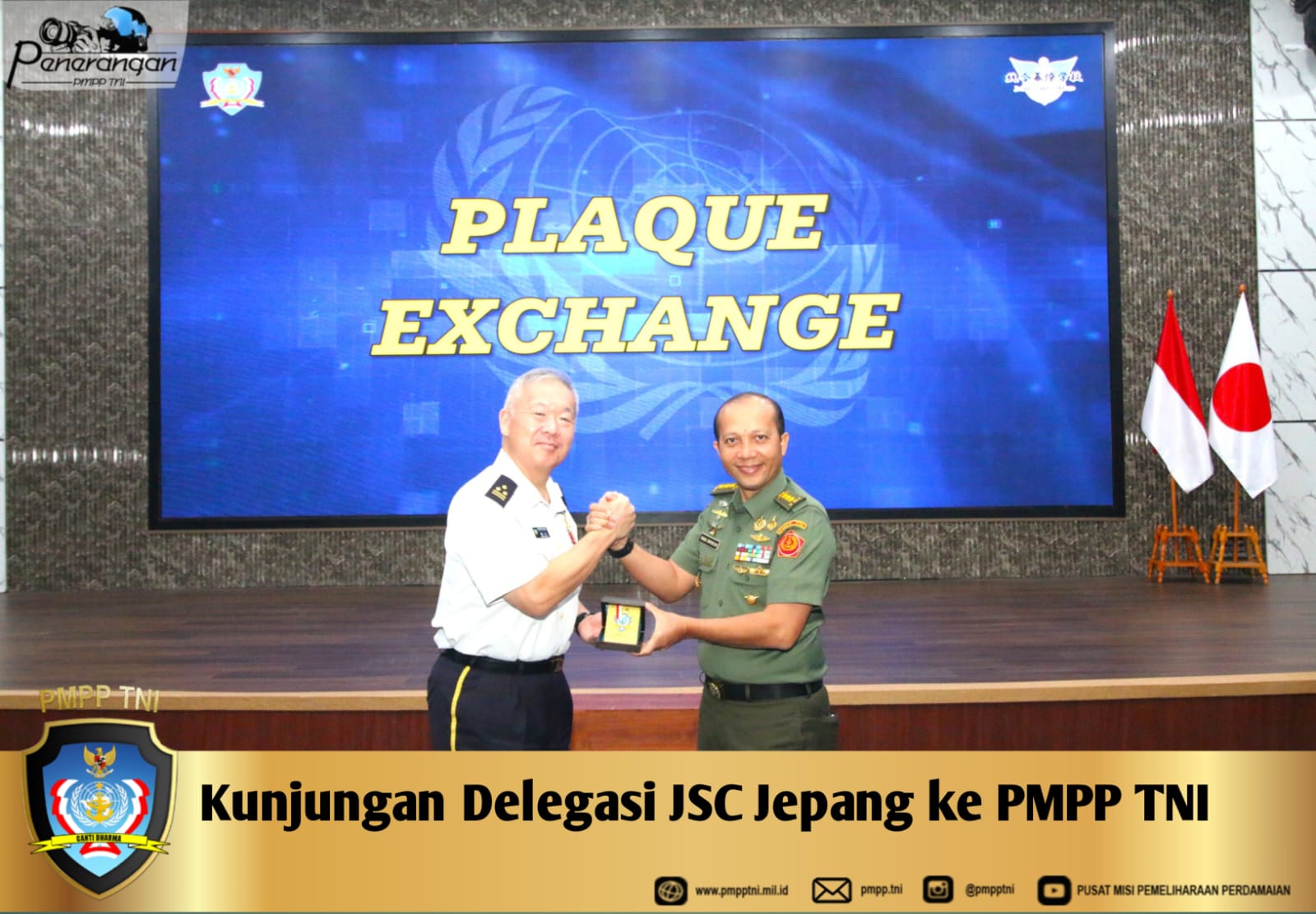 Pusat Misi Pemeliharaan Perdamaian (PMPP TNI) menerima kunjungan akademik dari delegasi Joint Staff College (JSC) Japan, bertempat di Gedung Auditorium PMPP TNI. Kunjungan ini merupakan bagian dari program kerja sama bilateral di bidang pemeliharaan perdamaian, serta upaya memperkuat pertukaran pengetahuan strategis antara Indonesia dan Jepang (Senin, 24 November 2025.)
