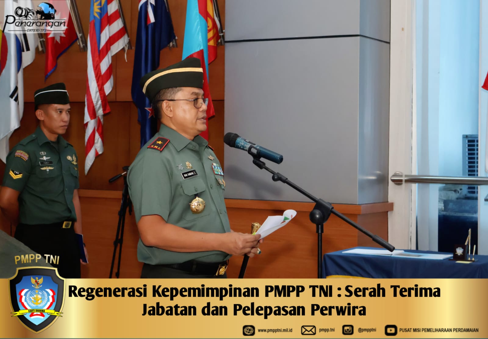 Komandan Pusat Misi Pemeliharaan Perdamaian (PMPP) TNI, Brigjen TNI Iwan Bambang Setiawan, S.I.P., memimpin upacara Serah Terima Jabatan Direktur Pembinaan Perencanaan (Dirbinren) PMPP TNI, Direktur Pembinaan Personel (Dirbinpers) PMPP TNI, Direktur Pembinaan Logistik (Dirbinlog) PMPP TNI, dan Komandan PSOPP PMPP TNI, sekaligus pelepasan tiga Perwira, bertempat di Markas Komando PMPP TNI, Sentul, Bogor, pada Senin (5/01/2026).