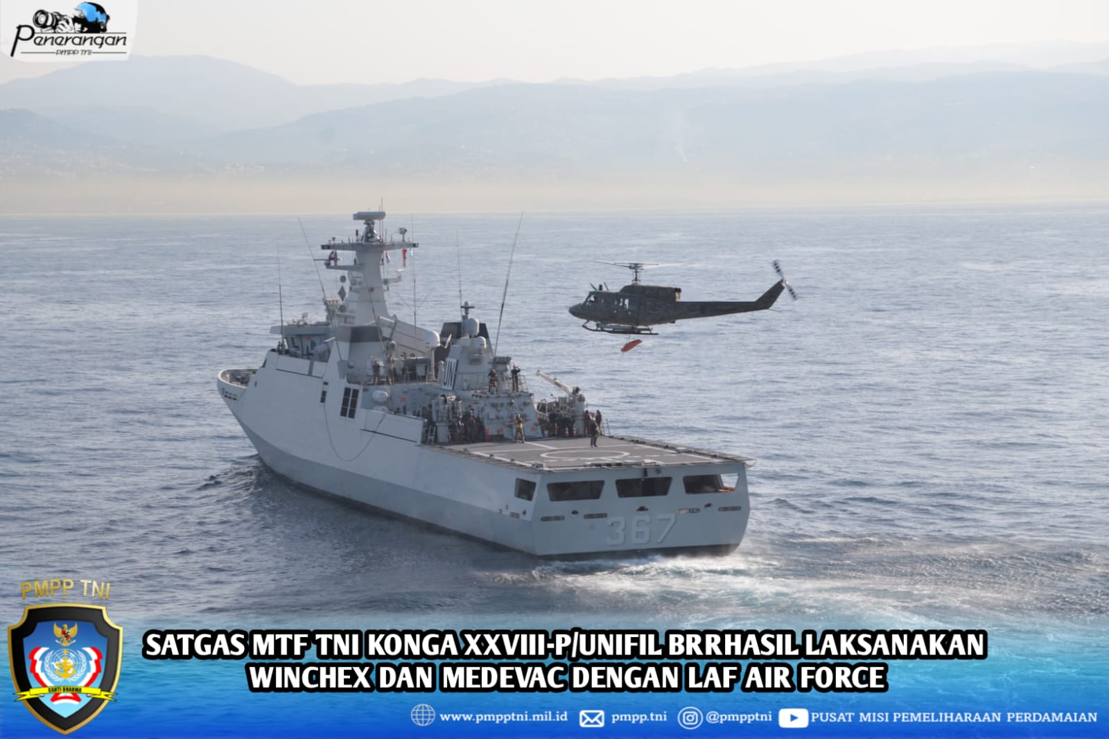 Laut Mediterania, 23 Desember 2025,—- KRI Sultan Iskandar Muda-367 (KRI SIM-367) yang merupakan unsur Satgas MTF TNI Konga XXVIII-P/UNIFIL, kembali mengukir prestasi dalam misi perdamaian dunia. Kali ini, KRI SIM-367 berhasil menggelar Latihan Winch (Winchex) dan Medical Evacuation (Medevac) bersama Angkatan Udara Lebanon (LAF-AF) di Area Operasi Maritim (AMO) Perairan Mediterania, Lebanon, Selasa (23/12).